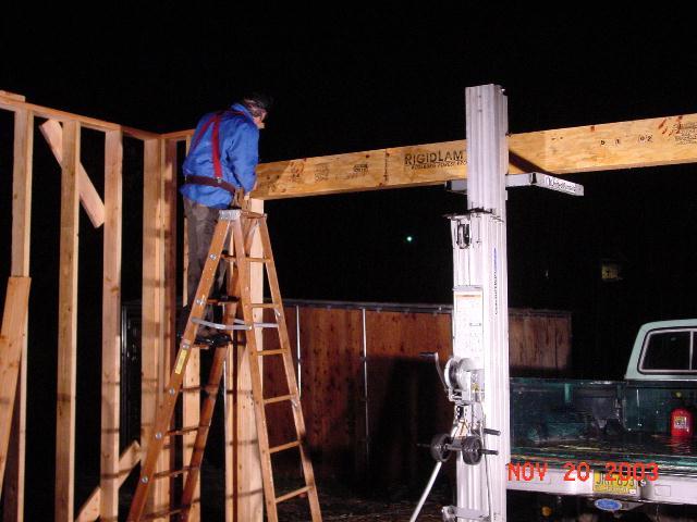We got pretty wet out in the rain installing the garage door header. I had the lift rented so there was no turing back. Previous Index Next