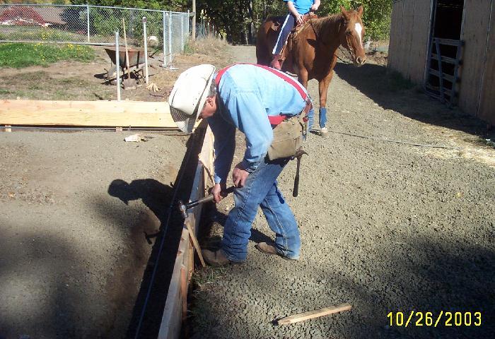Now that the forms are level, they need to be supported to hold in the weight of the concrete. It was sunny enough that I thought I should were my hat to protect my balding head.That's Anna on Ginger in the back ground.